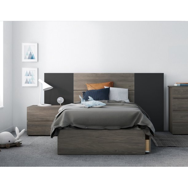 Grey 4 Piece Bedroom Furniture Set. The Gardinier bedroom set comes in a soothing Anthracite Matte Grey finish with matching grey velvet upholstery on the headboard and drawers. The panel bed is crafted from distressed dark gray solid rubberwood and oak veneers for a contemporary touch.